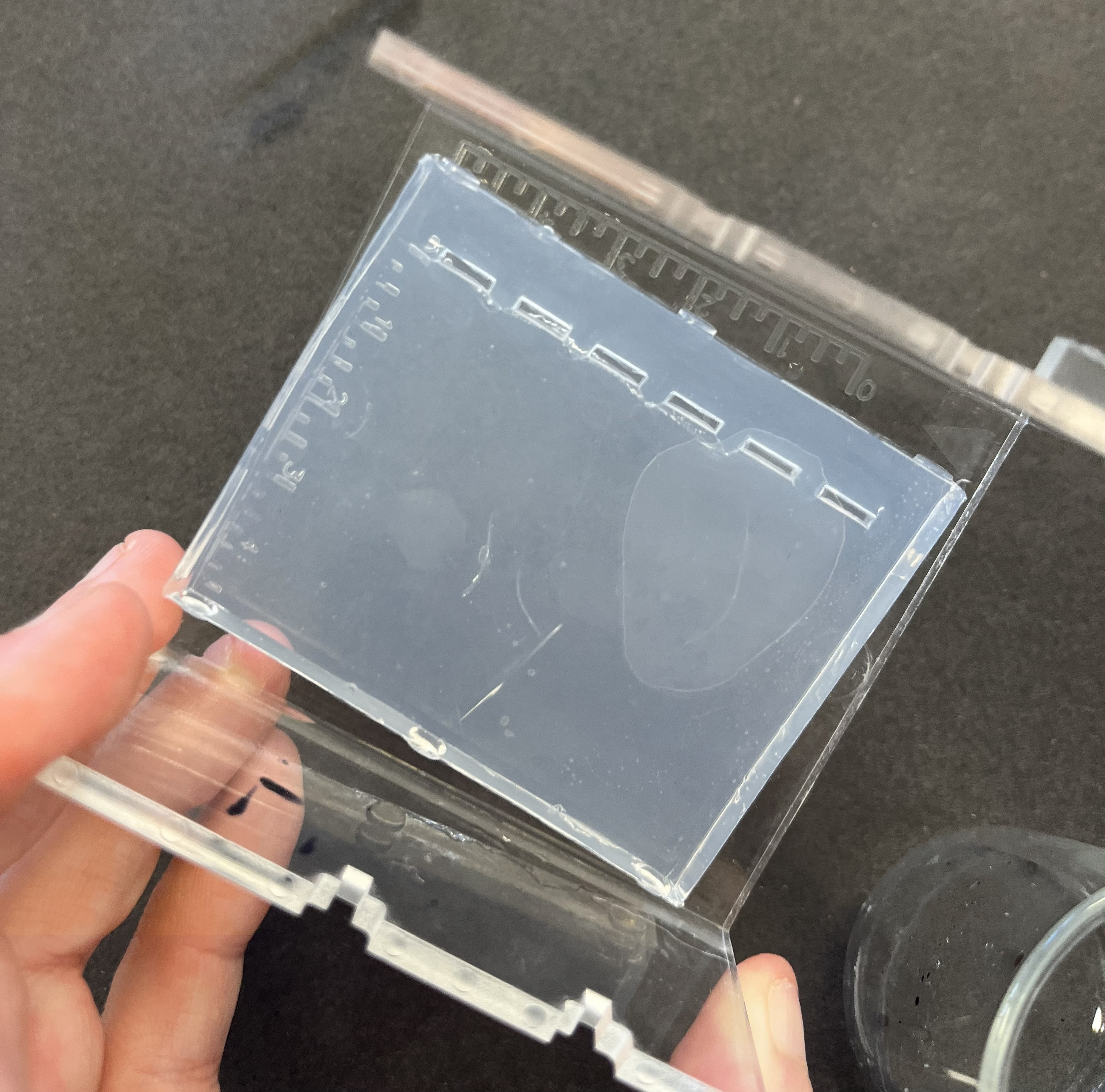 - Setting up the electrophoresis tank – Gels were submerged in buffer solution to allow electrical current to pass once DNA was loaded.