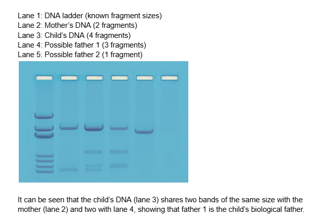 - Staining and visualising the results – The gels were treated with blue dye to make DNA fragments clearly visible, producing a final DNA profile.